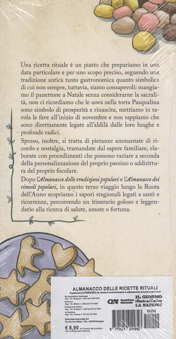 Una ricetta rituale è un piatto che prepariamo in una data particolare e per uno scopo preciso, seguendo una tradizione antica tanto gastronomica quanto simbolica di cui non sempre, tuttavia, siamo consapevoli: mangiamo il panettone a Natale senza considerarne la sacralità, non ci ricordiamo che le uova nella torta Pasqualina sono simbolo di prosperità e rinascita, mettiamo in tavola le fave all'inizio di novembre e non sappiamo che sono direttamente legate all'aldilà dalle loro lunghe e profonde radici. Spesso, inoltre, si tratta di pietanze ammantate di ricordo e nostalgia, tramandate dal sapere familiare, elaborate con procedimenti che possono variare a seconda della personalizzazione del proprio paesino o addirittura del proprio focolare. Dopo l'Almanacco delle tradizioni popolari e l'Almanacco dei rimedi popolari, in questo terzo viaggio lungo la Ruota dell'Anno scopriamo i sapori stagionali legati a santi e ricorrenze, percorrendo un itinerario goloso e leggendario alla ricerca di salute, amore o fortuna.