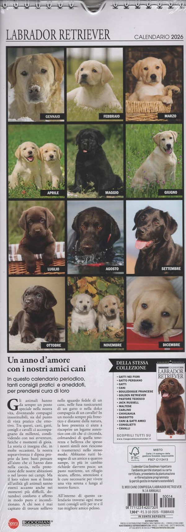 Scopri il calendario Goodman 2026 dedicato ai Labrador Retriever. Elegante e funzionale, con immagini adorabili di cuccioli per ogni mese. Ideale per pianificare l'anno con il sorriso.