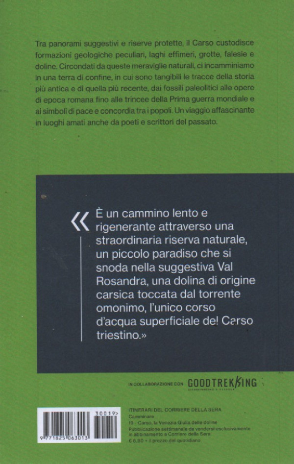 - Tra panorami suggestivi e riserve protette, il Carso custodisce formazioni geologiche peculiari, laghi effimeri, grotte, falesie e doline. Circondati da queste meraviglie naturali, ci incamminiamo in una terra di confine, in cui sono tangibili le tracce della storia più antica e di quella più recente, dai fossili paleolitici alle opere di epoca romana fino alle trincee della Prima guerra mondiale e ai simboli di pace e concordia tra i popoli. Un viaggio affascinante in luoghi amati anche da poeti e scrittori del passato.