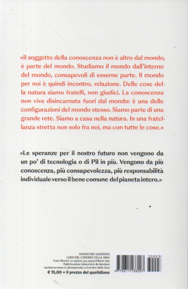 - «Il soggetto della conoscenza non è altro dal mondo, è parte del mondo. Studiamo il mondo dall'interno del mondo, consapevoli di esserne parte. Il mondo per noi è quindi incontro, relazione. Delle cose della natura siamo fratelli, non giudici. La conoscenza non vive disincarnata fuori dal mondo: è una delle configurazioni del mondo stesso. Siamo parte di una grande rete. Siamo a casa nella natura. In una fratellanza stretta non solo fra noi, ma con tutte le cose.>> <>