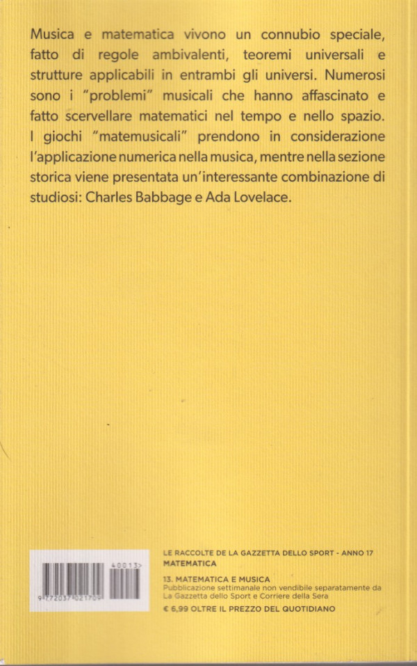 - Musica e matematica vivono un connubio speciale, fatto di regole ambivalenti, teoremi universali e strutture applicabili in entrambi gli universi. Numerosi sono i "problemi" musicali che hanno affascinato e fatto scervellare matematici nel tempo e nello spazio. I giochi "matemusicali" prendono in considerazione l'applicazione numerica nella musica, mentre nella sezione storica viene presentata un'interessante combinazione di studiosi: Charles Babbage e Ada Lovelace.