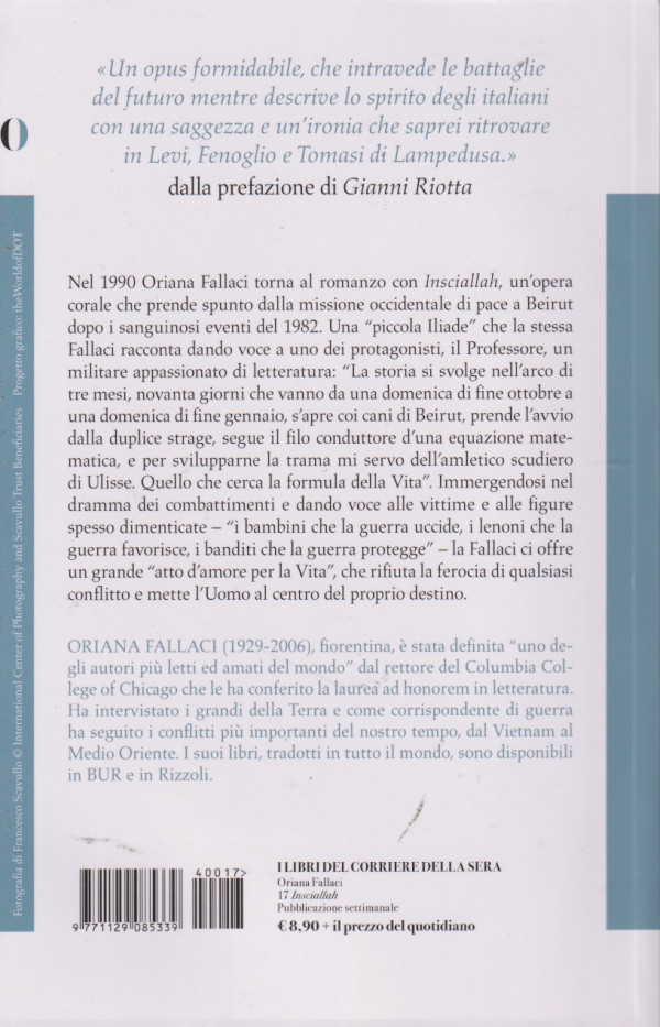 - «Un opus formidabile, che intravede le battaglie del futuro mentre descrive lo spirito degli italiani con una saggezza e un'ironia che saprei ritrovare in Levi, Fenoglio e Tomasi di Lampedusa.» dalla prefazione di Gianni Riotta Nel 1990 Oriana Fallaci torna al romanzo con Insciallah, un'opera corale che prende spunto dalla missione occidentale di pace a Beirut dopo i sanguinosi eventi del 1982. Una "piccola Iliade" che la stessa Fallaci racconta dando voce a uno dei protagonisti, il Professore, un militare appassionato di letteratura: "La storia si svolge nell'arco di tre mesi, novanta giorni che vanno da una domenica di fine ottobre a una domenica di fine gennaio, s'apre coi cani di Beirut, prende l'avvio dalla duplice strage, segue il filo conduttore d'una equazione matematica, e per svilupparne la trama mi servo dell'amletico scudiero di Ulisse. Quello che cerca la formula della Vita". Immergendosi nel dramma dei combattimenti e dando voce alle vittime e alle figure spesso dimenticate-"i bambini che la guerra uccide, i lenoni che la guerra favorisce, i banditi che la guerra protegge"-la Fallaci ci offre un grande "atto d'amore per la Vita", che rifiuta la ferocia di qualsiasi conflitto e mette l'Uomo al centro del proprio destino. ORIANA FALLACI (1929-2006), fiorentina, è stata definita "uno de- gli autori più letti ed amati del mondo" dal rettore del Columbia Col- lege of Chicago che le ha conferito la laurea ad honorem in letteratura. Ha intervistato i grandi della Terra e come corrispondente di guerra ha seguito i conflitti più importanti del nostro tempo, dal Vietnam al Medio Oriente. I suoi libri, tradotti in tutto il mondo, sono disponibili in BUR e in Rizzoli.