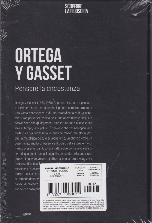 - Ortega y Gasset (1883 1955) è prima di tutto, un pensatore delle lettere che intraprende il proprio compito armato di una vasta conoscenza e di una straordinaria cultura generale Gran parte del fascino delle sue opere risiede nella sua convinzione che gli argomenti intellettuali sono anche, e allo stesso tempo, temi politici E convinto che per sviluppare una metafisica sia necessario, in qualche modo fare storia, poichè la metafisica cela, lo si voglia o no, un obbligo verso un determinato modo di osservare il corso della storia e il mo mento presente. La filosofia, infatti, esige consapevolezza di sé e di quanto circonda il soggetto pensante, della sua circostanza in questo volume si affronta in una forma espositiva.......