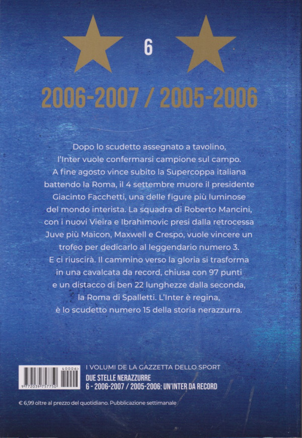 - Dopo lo scudetto assegnato a tavolino, l'Inter vuole confermarsi campione sul campo. A fine agosto vince subito la Supercoppa italiana battendo la Roma, il 4 settembre muore il presidente Giacinto Facchetti, una delle figure più luminose del mondo interista. La squadra di Roberto Mancini, con i nuovi Vieira e Ibrahimovic presi dalla retrocessa Juve più Maicon, Maxwell e Crespo, vuole vincere un trofeo per dedicarlo al leggendario numero 3. E ci riuscirà. Il cammino verso la gloria si trasforma in una cavalcata da record, chiusa con 97 punti e un distacco di ben 22 lunghezze dalla seconda, la Roma di Spalletti. L'Inter è regina, è lo scudetto numero 15 della storia nerazzurra.