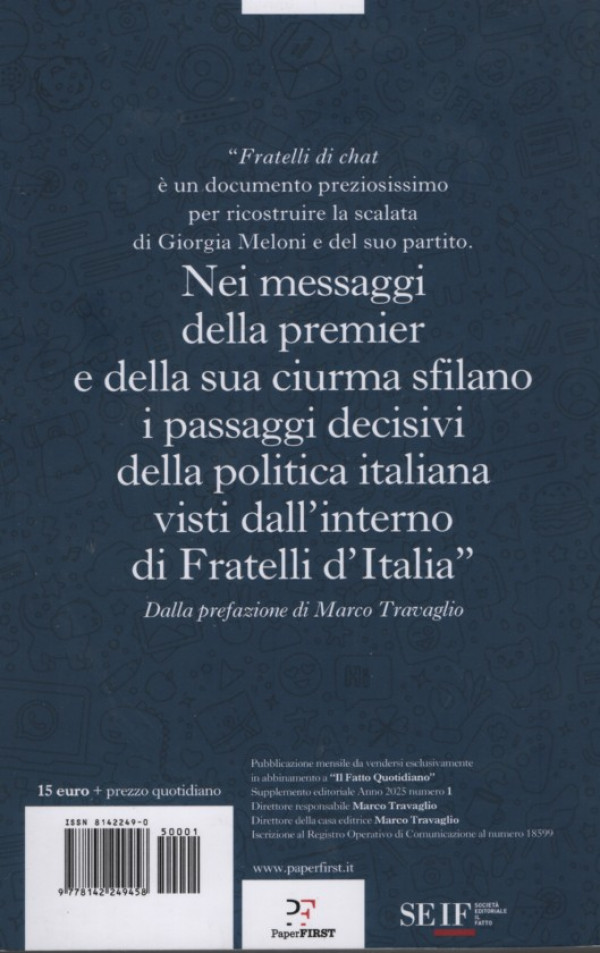 Scopri i retroscena e le dinamiche interne del partito di Giorgia Meloni con il libro 'Fratelli di Chat' di Giacomo Salvini. Arricchito da una prefazione di Marco Travaglio e documenti esclusivi, questo volume esplora le vicende nascoste dietro le quinte politiche.