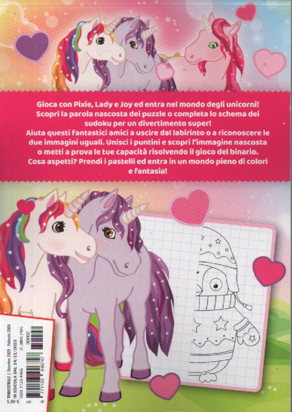 - Gioca con Pixie, Lady e Joy ed entra nel mondo degli unicorni! Scopri la parola nascosta dei puzzle o completa lo schema dei sudoku per un divertimento super! Aiuta questi fantastici amici a uscire dal labirinto o a riconoscere le due immagini uguali. Unisci i puntini e scopri l'immagine nascosta o metti a prova le tue capacità risolvendo il gioco del binario. Cosa aspetti? Prendi i pastelli ed entra in un mondo pieno di colori e fantasia!