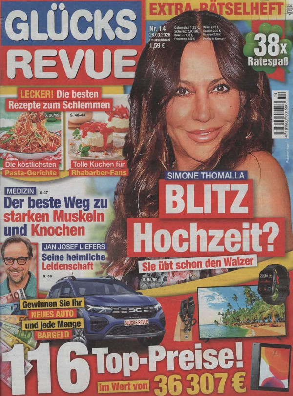 Scopri i segreti delle celebrità con il nuovo numero di Glücks Revue! Ricette deliziose, consigli per la salute e 38 cruciverba per intrattenerti. In più, scopri se ci sarà un matrimonio lampo e vinci premi straordinari!
