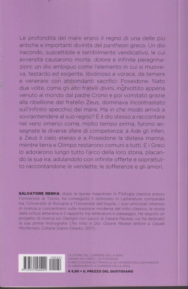 - Le profondità del mare erano il regno di una delle più antiche e importanti divinità del pantheon greco. Un dio iracondo, suscettibile e terribilmente vendicativo, le cui avversità causarono morte, dolore e infinite peregrina- zioni un dio ambiguo come l'elemento in cui si muove- va, testardo ed esigente, libidinoso e vorace, da temere e venerare con abbondanti sacrifici: Poseidone. Nato due volte, come gi altri fratelli divini, inghiottito appena venuto al mondo dal padre Crono e poi vomitato grazie alla ribellione del fratello Zeus, dominava incontrastato sull'infinito specchio del mare. Ma in che modo arrivo a sovraintendere al suo regno? Eil dio stesso a raccontare nei versi omerici come, molto tempo prima, furono as- segnate le diverse sfere di competenza: a Ade gli inferi, a Zeus il cielo etereo e a Poseidone la distesa marina, mentre terra e Olimpo restarono comuni a tutti. Ei Greci lo adorarono lungo tutto l'arco della loro storia, placan- do la sua ira, adulandolo con infinite offerte e soprattut- to raccontandone le vendette, le sofferenze e gli amori.