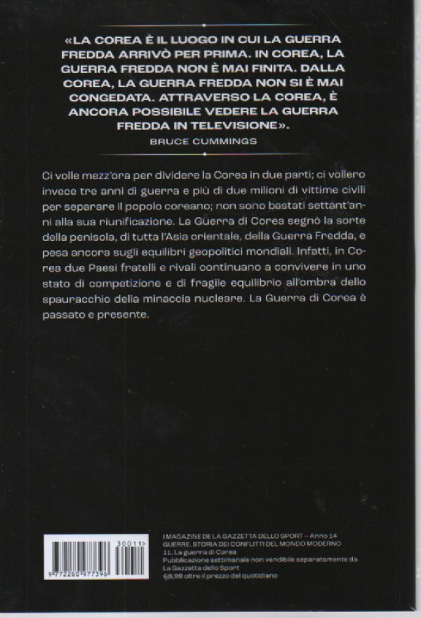 - <. BRUCE CUMMINGS Ci volle mezz'ora per dividere la Corea in due parti; ci vollero invece tre anni di guerra e più di due milioni di vittime civili por separare il popolo coreano; non sono bastati settant'anni alla sua riunificazione. La Guerra di Corea segnò la sorte della penisola, di tutta l'Asia orientale, della Guerra Fredda, e pesa ancora sugli equilibri geopolitici mondiali. Infatti, in Co- rea due Paesi fratelli e rivali continuano a convivere in uno stato di competizione e di fragile equilibrio all'ombra dello spauracchio della minaccia nucleare. La Guerra di Corea è passato e presente.