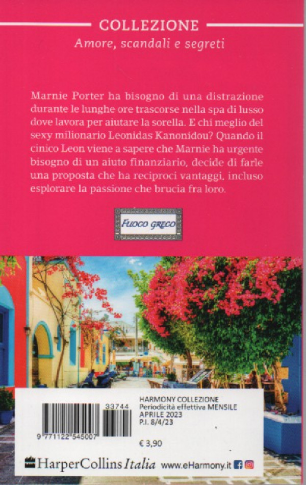 - Marnie Porter ha bisogno di una distrazione durante le lunghe ore trascorse nella spa di lusso dove lavora per aiutare la sorella. E chi meglio del sexy milionario Leonidas Kanonidou? Quando il cinico Leon viene a sapere che Marnie ha urgente bisogno di un aiuto finanziario, decide di farle una proposta che ha reciproci vantaggi, incluso esplorare la passione che brucia fra loro.