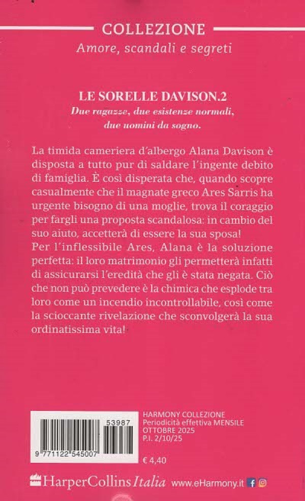La timida cameriera d'albergo Alana Davison è disposta a tutto pur di saldare l'ingente debito di famiglia. È cosi disperata che, quando scopre casualmente che il magnate greco Ares Sarris ha urgente bisogno di una moglie, trova il coraggio per fargli una proposta scandalosa in cambio del suo aiuto, accetterà di essere la sua sposa! Per l'inflessibile Ares, Alana è la soluzione perfetta: il loro matrimonio gli permetterà infatti di assicurarsi l'eredità che gli è stata negata. Ciò che non può prevedere è la chimica che esplode tra loro come un incendio incontrollabile, così come la scioccante rivelazione che sconvolgerà la sua ordinatissima vita!