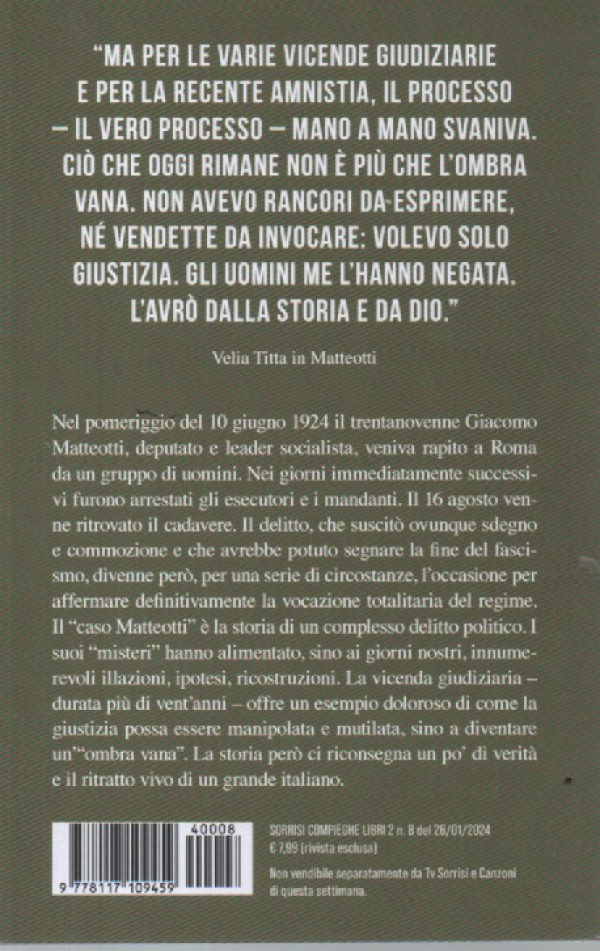 - "MA PER LE VARIE VICENDE GIUDIZIARIE E PER LA RECENTE AMNISTIA, IL PROCESSO - IL VERO PROCESSO-MANO A MANO SVANIVA. CIÒ CHE OGGI RIMANE NON È PIÙ CHE L'OMBRA VANA. NON AVEVO RANCORI DA-ESPRIMERE, NÉ VENDETTE DA INVOCARE: VOLEVO SOLO GIUSTIZIA, GLI UOMINI ME L'HANNO NEGATA. L'AVRÒ DALLA STORIA E DA DIO." Velia Titta in Matteotti Nel pomeriggio del 10 giugno 1924 il trentanovenne Giacomo Matteotti, deputato e leader socialista, veniva rapito a Roma da un gruppo di uomini. Nei giorni immediatamente successi- vi furono arrestati gli esecutori e i mandanti. Il 16 agosto venne ritrovato il cadavere. Il delitto, che suscitò ovunque sdegno e commozione e che avrebbe potuto segnare la fine del fascismo, divenne però, per una serie di circostanze, l'occasione per affermare definitivamente la vocazione totalitaria del regime. Il "caso Matteotti" è la storia di un complesso delitto politico. I suoi "misteri" hanno alimentato, sino ai giorni nostri, innumerevoli illazioni, ipotesi, ricostruzioni. La vicenda giudiziaria - durata più di vent'anni - offre un esempio doloroso di come la giustizia possa essere manipolata e mutilata, sino a diventare un'ombra vana". La storia però ci riconsegna un po' di verità e il ritratto vivo di un grande italiano.