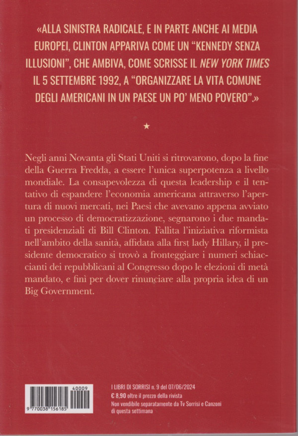 - «ALLA SINISTRA RADICALE, E IN PARTE ANCHE AI MEDIA EUROPEI, CLINTON APPARIVA COME UN "KENNEDY SENZA ILLUSIONI", CHE AMBIVA, COME SCRISSE IL NEW YORK TIMES IL 5 SETTEMBRE 1992, A "ORGANIZZARE LA VITA COMUNE DEGLI AMERICANI IN UN PAESE UN PO' MENO POVERO".>> Negli anni Novanta gli Stati Uniti si ritrovarono, dopo la fine della Guerra Fredda, a essere l'unica superpotenza a livello mondiale. La consapevolezza di questa leadership e il ten- tativo di espandere l'economia americana attraverso l'apertura di nuovi mercati, nei Paesi che avevano appena avviato un processo di democratizzazione, segnarono i due mandati presidenziali di Bill Clinton. Fallita l'iniziativa riformista nell'ambito della sanità, affidata alla first lady Hillary, il presidente democratico si trovò a fronteggiare i numeri schiaccianti dei repubblicani al Congresso dopo le elezioni di metà mandato, e fini per dover rinunciare alla propria idea di un Big Government.