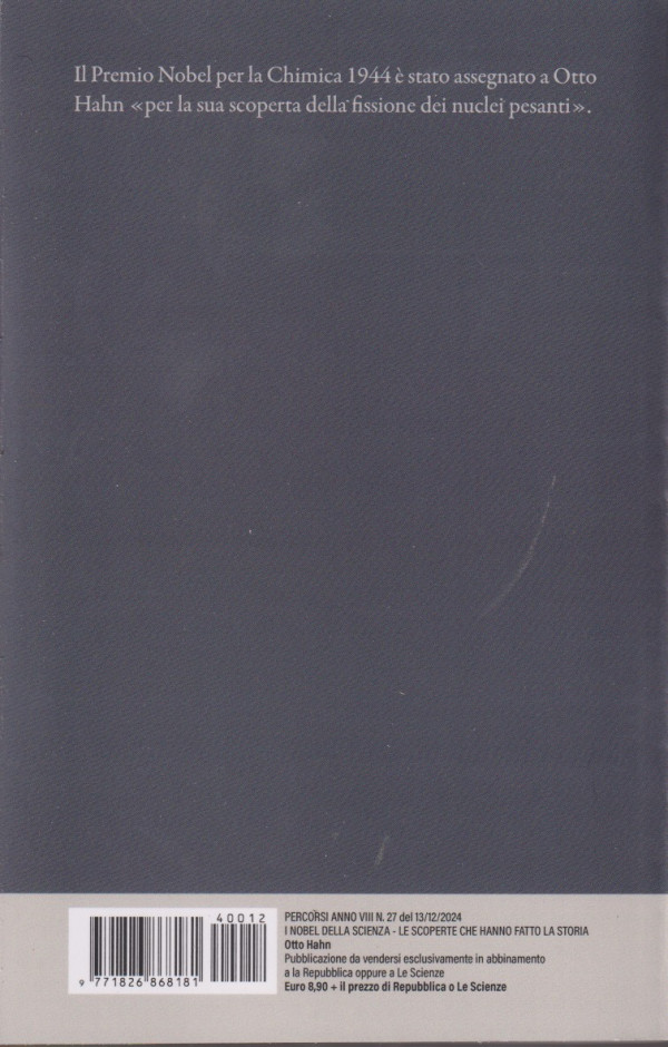 - Premio Nobel per la Chimica 1944 è stato assegnato a Otto Hahn per la sua scoperta della fissione dei nuclei pesanti »>.