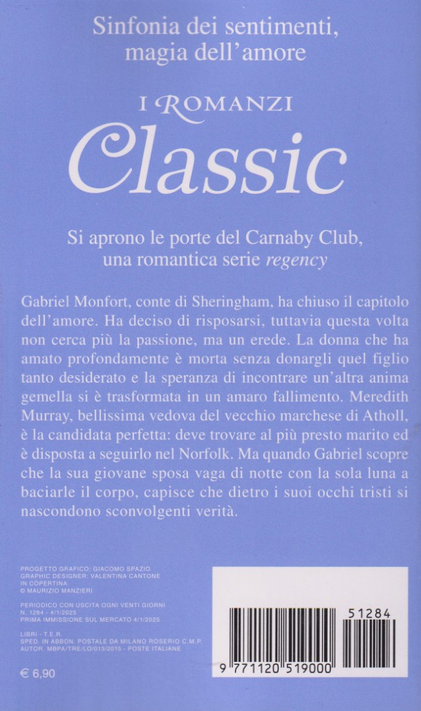 - Si aprono le porte del Carnaby Club, una romantica serie regency Gabriel Monfort, conte di Sheringham, ha chiuso il capitolo dell'amore. Ha deciso di risposarsi, tuttavia questa volta non cerca più la passione, ma un erede. La donna che ha amato profondamente è morta senza donargli quel figlio tanto desiderato e la speranza di incontrare un'altra anima gemella si è trasformata in un amaro fallimento. Meredith Murray, bellissima vedova del vecchio marchese di Atholl, è la candidata perfetta: deve trovare al più presto marito ed è disposta a seguirlo nel Norfolk. Ma quando Gabriel scopre che la sua giovane sposa vaga di notte con la sola luna a baciarle il corpo, capisce che dietro i suoi occhi tristi si nascondono sconvolgenti verità.