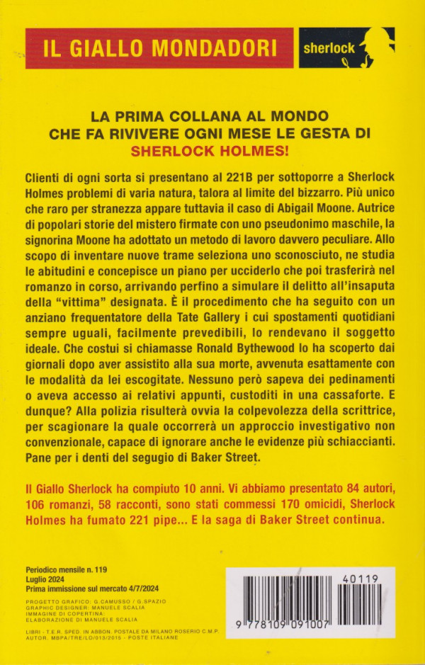 - LA PRIMA COLLANA AL MONDO CHE FA RIVIVERE OGNI MESE LE GESTA DI SHERLOCK HOLMES! Clienti di ogni sorta si presentano al 221B per sottoporre a Sherlock Holmes problemi di varia natura, talora al limite del bizzarro. Più unico che raro per stranezza appare tuttavia il caso di Abigail Moone. Autrice di popolari storie del mistero firmate con uno pseudonimo maschile, la signorina Moone ha adottato un metodo di lavoro davvero peculiare. Allo scopo di inventare nuove trame seleziona uno sconosciuto, ne studia le abitudini e concepisce un piano per ucciderlo che poi trasferirà nel romanzo in corso, arrivando perfino a simulare il delitto all'insaputa della "vittima" designata. È il procedimento che ha seguito con un anziano frequentatore della Tate Gallery i cui spostamenti quotidiani sempre uguali, facilmente prevedibili, lo rendevano il soggetto ideale. Che costui si chiamasse Ronald Bythewood lo ha scoperto dai giornali dopo aver assistito alla sua morte, avvenuta esattamente con le modalità da lei escogitate. Nessuno però sapeva dei pedinamenti o aveva accesso ai relativi appunti, custoditi in una cassaforte. E dunque? Alla polizia risulterà ovvia la colpevolezza della scrittrice, per scagionare la quale occorrerà un approccio investigativo non convenzionale, capace di ignorare anche le evidenze più schiaccianti. Pane per i denti del segugio di Baker Street. Il Giallo Sherlock ha compiuto 10 anni. Vi abbiamo presentato 84 autori, 106 romanzi, 58 racconti, sono stati commessi 170 omicidi, Sherlock Holmes ha fumato 221 pipe... E la saga di Baker Street continua.