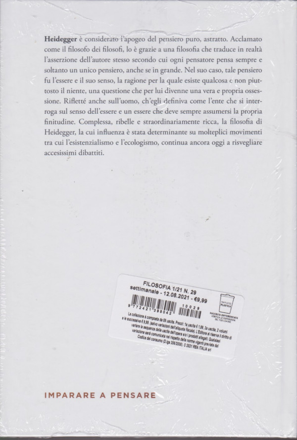 - Heidegger è considerato i'apogeo del pensiero puro, astratto. Acclamato come il filosofo dei filosofi, lo è grazie a una filosofia che traduce in realtà l'asserzione dell'autore stesso secondo cui ogni pensatore pensa sempre e soltanto un unico pensiero, anche se in grande. Nel suo caso, tale pensiero fu l'essere e il suo senso, la ragione per la quale esiste quakcosa e non piut- tosto il niente, una questione che per lui divenne una vera e propria osses- sione. Rifletté anche sull'uomo, ch'egli definiva come l'ente che si inter- roga sul senso dell'essere e un essere che deve sempre assumersi la propria finitudine. Complessa, ribelle e straordinariamente rica, la filosofia di Heidegger, la cui influenza è stata determinante su molteplici movimenti tra cui l'esistenzialismo e l'ecologismo, continua ancora oggi a risvegliare accesissimi dibattiti.