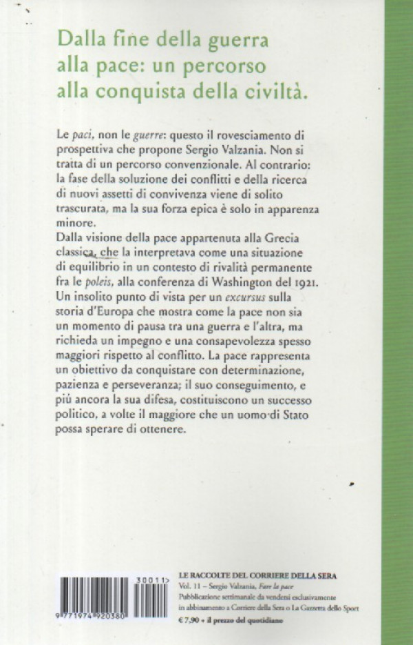 - Le paci, non le guerre: questo il rovesciamento di prospettiva che propone Sergio Valzania. Non si tratta di un percorso convenzionale. Al contrario: la fase della soluzione dei conflitti e della ricerca di nuovi assetti di convivenza viene di solito trascurata, ma la sua forza epica è solo in apparenza minore. Dalla visione della pace appartenuta alla Grecia classica, che la interpretava come una situazione di equilibrio in un contesto di rivalità permanente fra le poleis, alla conferenza di Washington del 1921. Un insolito punto di vista per un excursus sulla storia d'Europa che mostra come la pace non sia un momento di pausa tra una guerra e l'altra, ma richieda un impegno e una consapevolezza spesso maggiori rispetto al conflitto. La pace rappresenta un obiettivo da conquistare con determinazione, pazienza e perseveranza; il suo conseguimento, e più ancora la sua difesa, costituiscono un successo politico, a volte il maggiore che un uomo di Stato possa sperare di ottenere.