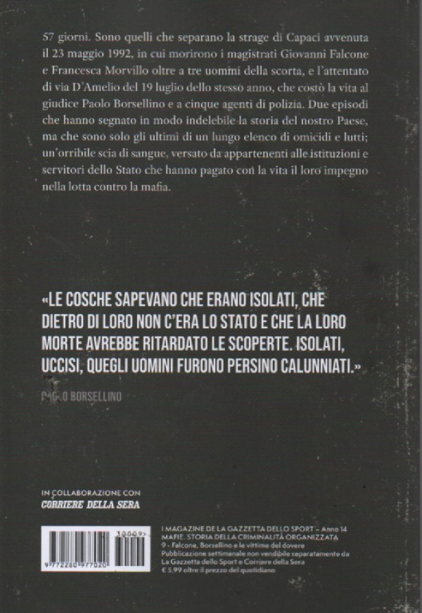 - "LE COSCHE SAPEVANO CHE ERANO ISOLATI, CHE DIETRO DI LORO NON C'ERA LO STATO E CHE LA LORO MORTE AVREBBE RITARDATO LE SCOPERTE. ISOLATI, UCCISI, QUEGLI UOMINI FURONO PERSINO CALUNNIATI."> PAOLO BORSELLINO