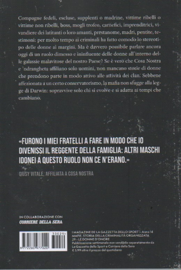 - Compagne fedeli, escluse, supplenti o madrine, vittime ribelli o vittime non ribelli, boss, mogli trofeo, carnefici, imprenditrici, vivandiere dei latitanti o loro amanti, prestanome, madri, pentite, testimoni: per molto tempo ai criminali ha fatto comodo lo stereotipo delle donne ai margini. Ma è davvero possibile parlare ancora oggi di un ruolo dimesso e ininfluente delle donne all'interno delle galassie malavitose del nostro Paese? Se è vero che Cosa Nostra e 'ndrangheta affiliano solo uomini, non mancano storie di donne che prendono parte in modo attivo alle attività dei clan: Sebbene affezionata a un certo conservatorismo, la mafia non sfugge alla legge di Darwin: sopravvive solo chi si evolve e si adatta ai tempi che cambiano.