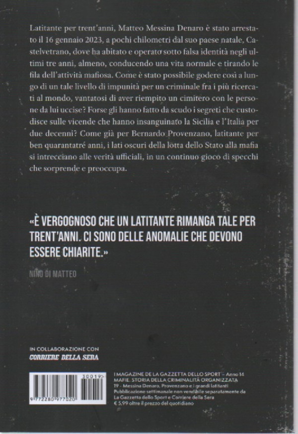- Latitante per trent'anni, Matteo Messina Denaro è stato arrestato il 16 gennaio 2023, a pochi chilometri dal suo paese natale, Castelvetrano, dove ha abitato e operato sotto falsa identità negli ultimi tre anni, almeno, conducendo una vita normale e tirando le fila dell'attività mafiosa. Come è stato possibile godere così a lungo di un tale livello di impunità per un criminale fra i più ricerca- ti al mondo, vantatosi di aver riempito un cimitero con le perso- ne da lui uccise? Forse gli hanno fatto da scudo i segreti che custodisce sulle vicende che hanno insanguinato la Sicilia e l'Italia per due decenni? Come già per Bernardo Provenzano, latitante per ben quarantatré anni, i lati oscuri della lotta dello Stato alla mafia si intrecciano alle verità ufficiali, in un continuo gioco di specchi che sorprende e preoccupa.