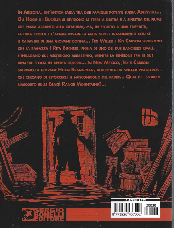 - IN ARIZONA, UN'ANTICA FAIDA TRA DUE FAMIGLIE POTENTI TURBA ABELSVILLE.. Gu HoGG E I BUCHLER SI DIVIDONO E TERRE A DESTRA E A SINISTRA DEL FIUME CHE PASSA ACCANTO ALLA CITTADINA, MA, IN SEGUTO A UNA TEMPESTA, LA DIGA CROLLA E L'ACQUA INVADE LA MAIN STREET TRASCINANDO CON SE IL CADAVERE DI UNA GIOVANE DONNA.. TEx WiuLER i Kn CARSON SCOPRONO CHE LA RAGAZZA È RITA BUCHLER, FIGUA DI UNO DE DUE RANCHERS RIVAU, E INDAGANO SUL MISTERIOSO ASSASSINIO, MENTRE LA TENSIONE TRA LE DUE DINASTIE SFOCIA IN APERTA OUERRA... IN NEw MEXICO, TEX E CARSON SALVANO LA GIOVANE HELEN BRANNIGAN, AGGREDITA DA SPIETATI PISTOLEROS CHE CERCANO DI ESTORCERLE IL NASCONDIGLIO DEL PADRE. QUAL È IL SEGRETO NASCOSTO SULL BLACK RANGE MOUNTAINS?...