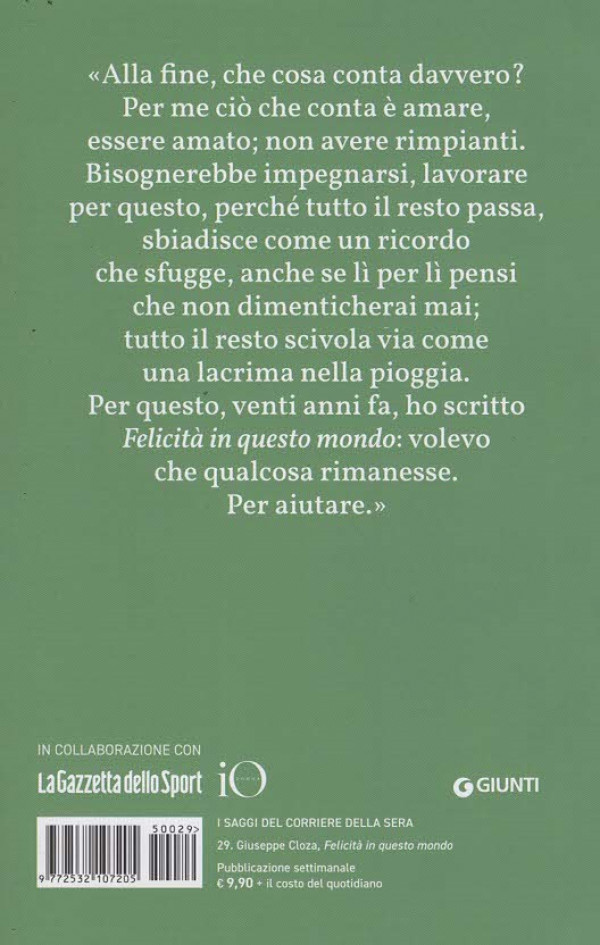 «Alla fine, che cosa conta davvero? Per me ciò che conta è amare, essere amato; non avere rimpianti. Bisognerebbe impegnarsi, lavorare per questo, perché tutto il resto passa, sbiadisce come un ricordo che sfugge, anche se lì per lì pensi che non dimenticherai mai; tutto il resto scivola via come una lacrima nella pioggia. Per questo, venti anni fa, ho scritto Felicità in questo mondo: volevo che qualcosa rimanesse. Per aiutare.»
