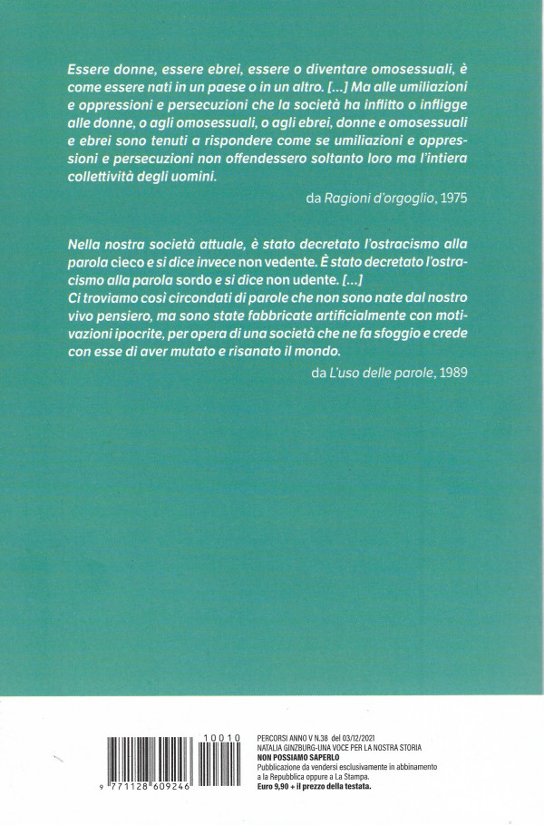 - Essere donne, essere ebrei, essere o diventare omosessuali, e come essere nati in un poese o in un altro. Ma alle umiliazioni e oppressioni e persecuzioni che la società ha inflitto o infligge alle donne, o agli omosessuali, o agli ebrei, donne e omosessuali e ebrei sono tenuti a rispondere come se umiliazionie oppres- sioni e persecuzioni non offendessero soltanto loro ma l'intiera collettività degli uomini. da Rogioni d'orgoglio, 1975