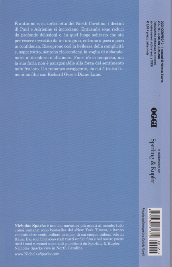 - Nicholas Sparks è uno dei narratori più amati al mondo: tutti i suoi romanzi sono bestseller del New York Times, e hanno venduto oltre cento milioni di copie, di cui cinque milioni solo in Italia. Dai suoi libri sono stati tratti undici film e nel nostro paese tutti i suoi romanzi sono stati pubblicati da Sperling & Kupfer. Nicholas Sparks vive in North Carolina. www.Nicholas Sparks.com