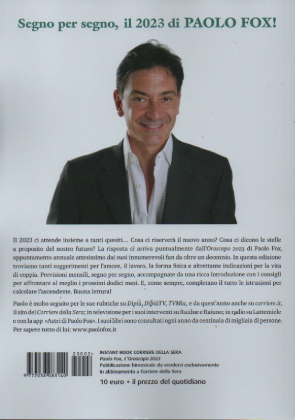 - Il 2023 ci attende insieme a tanti quesiti... Cosa ci riserverà il nuovo anno? Cosa ci dicono le stelle a proposito del nostro futuro? La risposta ci arriva puntualmente dall'Oroscopo 2023 di Paolo Fox, appuntamento annuale attesissimo dai suoi innumerevoli fan da oltre un decennio. In questa edizione troviamo tanti suggerimenti per l'amore, il lavoro, la forma fisica e altrettante indicazioni per la vita di coppia. Previsioni mensili, segno per segno, accompagnate da una ricca introduzione con i consigli per affrontare al meglio i prossimi dodici mesi. E, come sempre, completano il tutto le istruzioni per calcolare l'ascendente. Buona lettura!