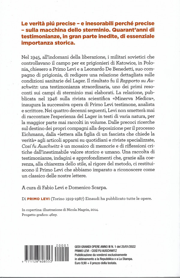 Nel 1945, all'indomani della liberazione, i militari sovietici che controllavano il campo per ex prigionieri di Katowiece, in Polo- nin, chiesero a Primo Levi ea Leonardo De Benedetti, suo com- pagno di prigionia, di redigere una relazione dettagliata sulle condizioni sanitarie del Lager. Il risultato fu il Rapporto su Au- schwitz: una testimonianza straordinaria, uno dei primi reso- conti sui campi di sterminio mai elaborati. La relazione, pub- blicata nel 1946 sulla rivista scientifica «Minerva Medica, inaugura la successiva opera di Primo Levi testimone, analista escrittore. Nei quattro decenni seguenti, Levi non smetterà mai di raccontare l'esperienza del Lager in testi di varia natura, per la maggior parte mai raccolti in volume. Dalle precoci ricerche sul destino dei propri compagni alla deposizione per il processo Eichmann, dalla «lettera alla figlia di un fascista che chiede la verità agli articoli apparsi su quotidiani e riviste specializzate, Cosí fu Auschwitz è un mosaico di memorie e di riflessioni cri- tiche dall'inestimabile valore storico e umano. Una raccolta di testimonianze, indagini e approfondimenti che, grazie alla coe- renza, alla chiarezza dello stile, al rigore del metodo, ci restitui- scono il Primo Levi che abbiamo imparato a riconoscere come un elassico delle nostre lettere.