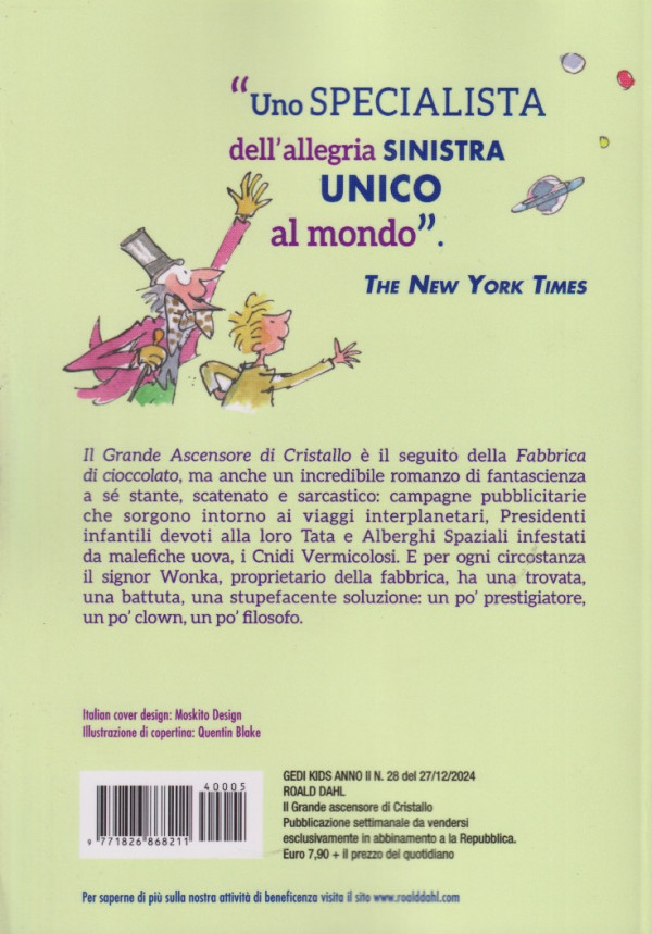 - "Uno SPECIALISTA dell'allegria SINISTRA UNICO al mondo". THE NEW YORK TIMES Il Grande Ascensore di Cristallo è il seguito della Fabbrica di cioccolato, ma anche un incredibile romanzo di fantascienza a sé stante, scatenato e sarcastico campagne pubblicitarie che sorgono intorno al viaggi interplanetari, Presidenti Infantili devoti alla loro Tata e Alberghi Spaziali infestati da malefiche uova, i Cnidi Vermicolosi. E per ogni circostanza il signor Wonka, proprietario della fabbrica ha una trovata, una battuta, una stupefacente soluzione un po' prestigiatore, un po' clown, un po' filosofo