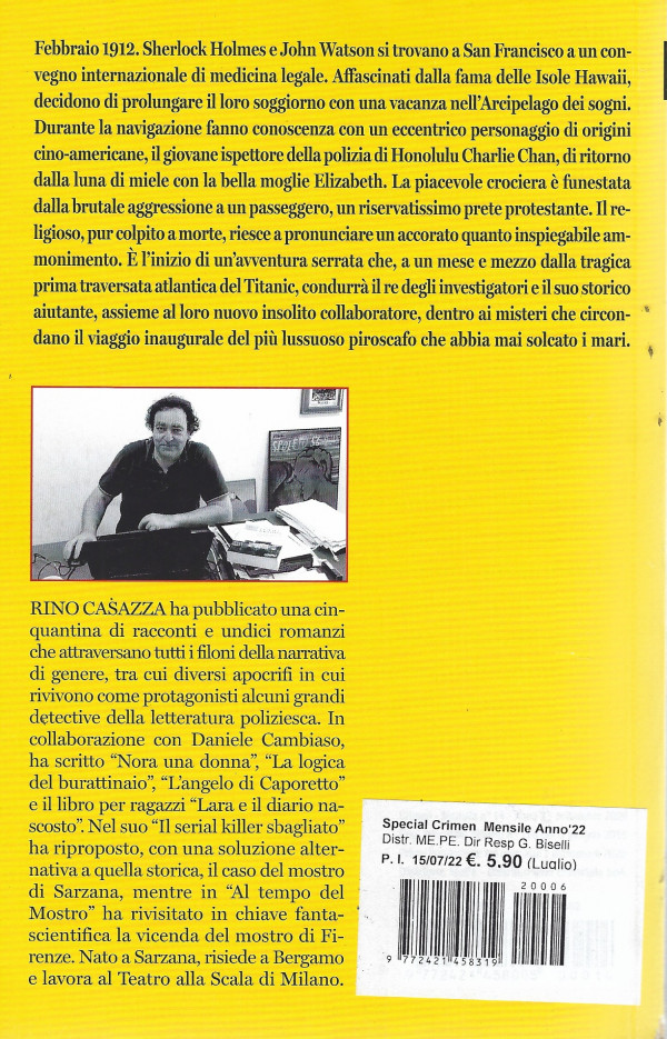 - Febbraio 1912. Sherlock Holmes e John Watson si trovano a San Francisco a un convegno internazionale di medicina legale. Affascinati dalla fama delle Isole Hawaii, decidono di prolungare il loro soggiorno con una vacanza nell'Arcipelago dei sogni. Durante la navigazione fanno conoscenza con un eccentrico personaggio di origini cino-americane, il giovane ispettore della polizia di Honolulu Charlie Chan, di ritorno dalla luna di miele con la bella moglie Elizabeth. La piacevole crociera è funestata dalla brutale aggressione a un passeggero, un riservatissimo prete protestante. Il religioso, pur colpito a morte, riesce a pronunciare un accorato quanto inspiegabile ammonimento. È l'inizio di un'avventura serrata che, a un mese e mezzo dalla tragica prima traversata atlantica del Titanic, condurrà il re degli investigatori e il suo storico aiutante, assieme al loro nuovo insolito collaboratore, dentro ai misteri che circon- dano il viaggio inaugurale del più lussuoso piroscafo che abbia mai solcato i mari.