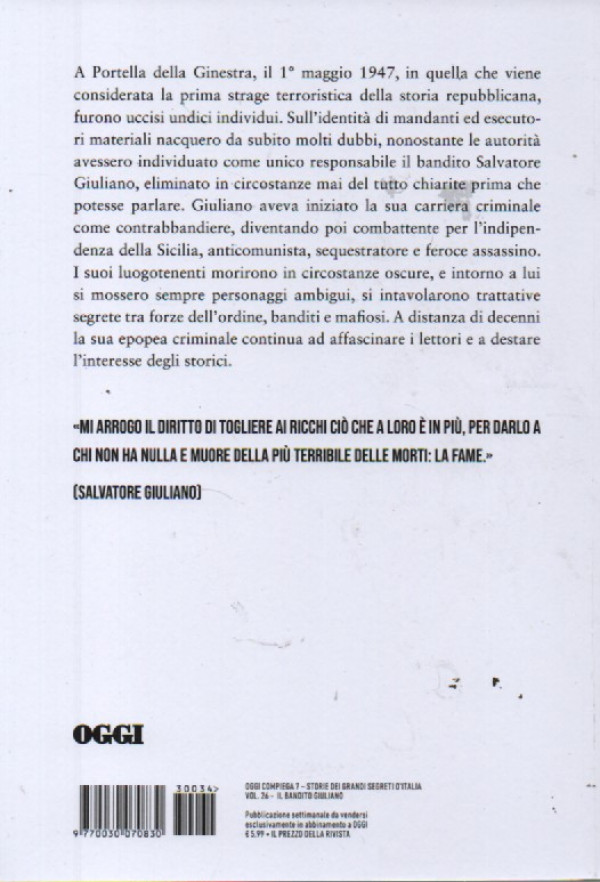 - A Portella della Ginestra, il 1° maggio 1947, in quella che viene considerata la prima strage terroristica della storia repubblicana, furono uccisi undici individui. Sull'identità di mandanti ed esecutori materiali nacquero da subito molti dubbi, nonostante le autorità avessero individuato come unico responsabile il bandito Salvatore Giuliano, eliminato in circostanze mai del tutto chiarite prima che potesse parlare. Giuliano aveva iniziato la sua carriera criminale come contrabbandiere, diventando poi combattente per l'indipendenza della Sicilia, anticomunista, sequestratore e feroce assassino. I suoi luogotenenti morirono in circostanze oscure, e intorno a lui si mossero sempre personaggi ambigui, si intavolarono trattative segrete tra forze dell'ordine, banditi e mafiosi. A distanza di decenni la sua epopea criminale continua ad affascinare i lettori e a destare l'interesse degli storici. -MI ARROGO IL DIRITTO DI TOGLIERE AI RICCHI CIÒ CHE A LORO È IN PIÙ, PER DARLO A CHI NON HA NULLA E MUORE DELLA PIÙ TERRIBILE DELLE MORTI: LA FAME. (SALVATORE GIULIANO]