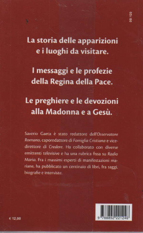 - La storia delle apparizioni e i luoghi da visitare. I messaggi e le profezie della Regina della Pace. Le preghiere e le devozioni alla Madonna e a Gesù. Saverio Gaeta è stato redattore dell'Osservatore Romano, caporedattore di Famiglia Cristiana e vice- direttore di Credere. Ha collaborato con diverse emittenti televisive e ha una rubrica fissa su Radio Maria. Fra i massimi esperti di manifestazioni mariane, ha pubblicato un centinaio di libri, fra saggi. biografie e interviste.